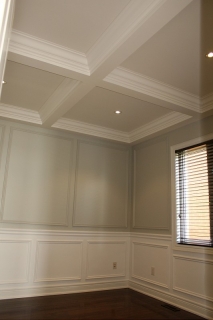 Stained natural wood coffered ceiling. We have available MDF coffered ceiling with 50 types of crown moulding.